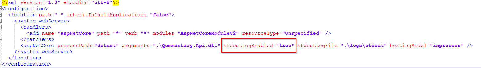 5. Change the *stdoutLogEnabled* to **true**\ <br>